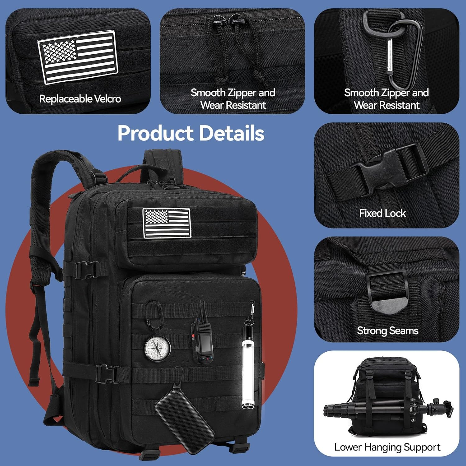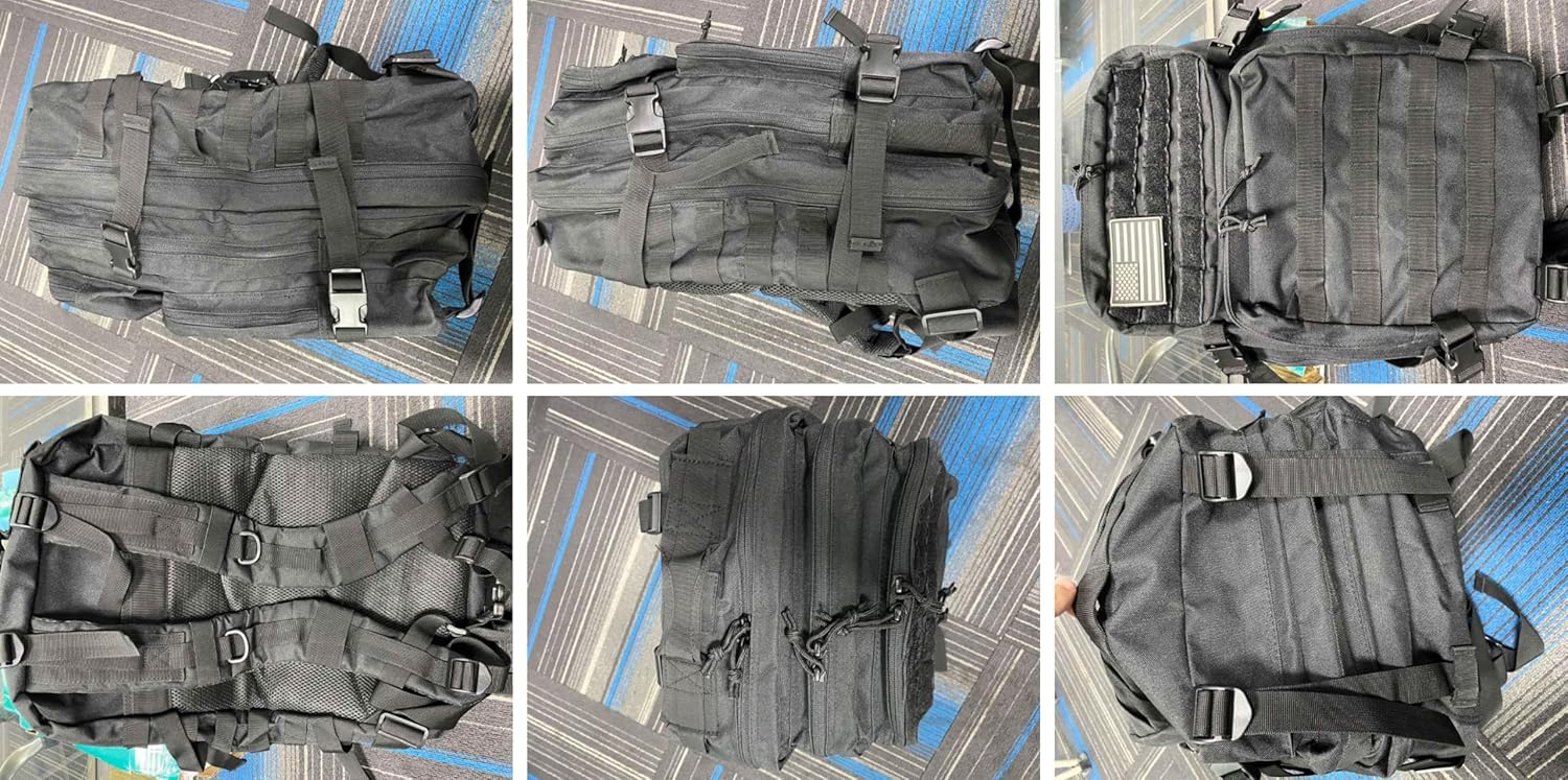 2. Sistema MOLLE: El diseño de correas MOLLE cortadas con láser te permite acoplar fácilmente otros equipos tácticos a la mochila, ampliando su capacidad y versatilidad.